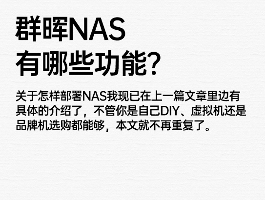 关于怎样部署NAS我现已在上一篇文章里边有具体的介绍了,不管你是自己DIY、虚拟机还是品牌机选购都能够,本文就不再重复了 当你具有一…